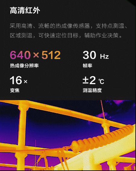 高清紅外:“御” 2 行業(yè)進(jìn)階版采用了高清、流暢的熱成像傳感器,支持點(diǎn)測溫、區(qū)域測溫,可快速定位目標(biāo),輔助作業(yè)決策。
