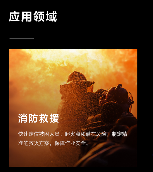 應(yīng)用領(lǐng)域廣泛:消防救援,快速定位被困人員,起火點(diǎn)和潛在風(fēng)險,制定精準(zhǔn)的救火方案,保障作業(yè)安全;應(yīng)急搜救,掃描搜索區(qū)域,迅速定位救援對象,及時營救;警務(wù)執(zhí)法,在抓捕、偵察等執(zhí)法場景中,高效獲取信息并快速決策,保障人員安全;能源巡檢,高效識別設(shè)備的缺陷和隱患,精準(zhǔn)掌握設(shè)備的運(yùn)行狀態(tài),提升巡檢效率及運(yùn)維水平;環(huán)境保護(hù),監(jiān)控環(huán)境變化,協(xié)助野生動物保護(hù)。